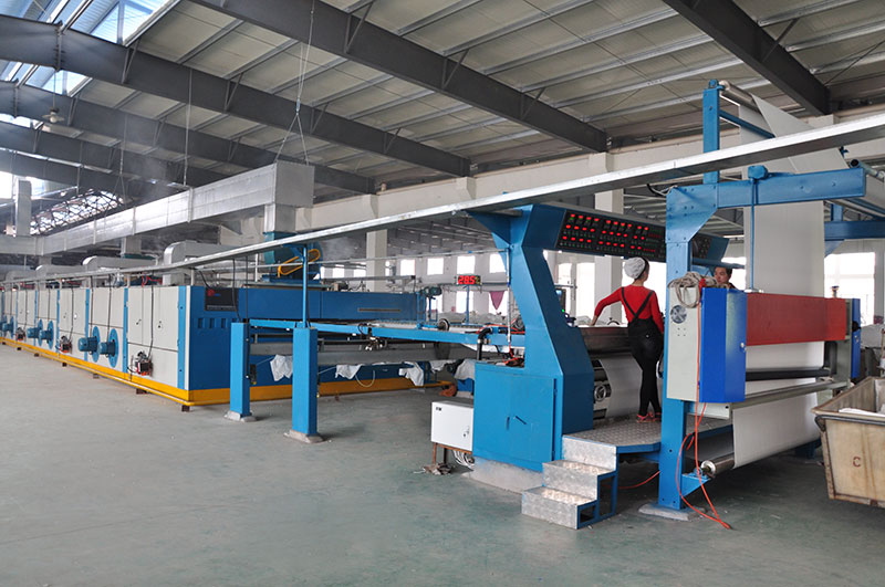 工艺流程:平幅进布 → 紧布架 → 对中 → 轧车 → 对中→ 上针 → 热风拉幅定型 → 冷却 → 落布